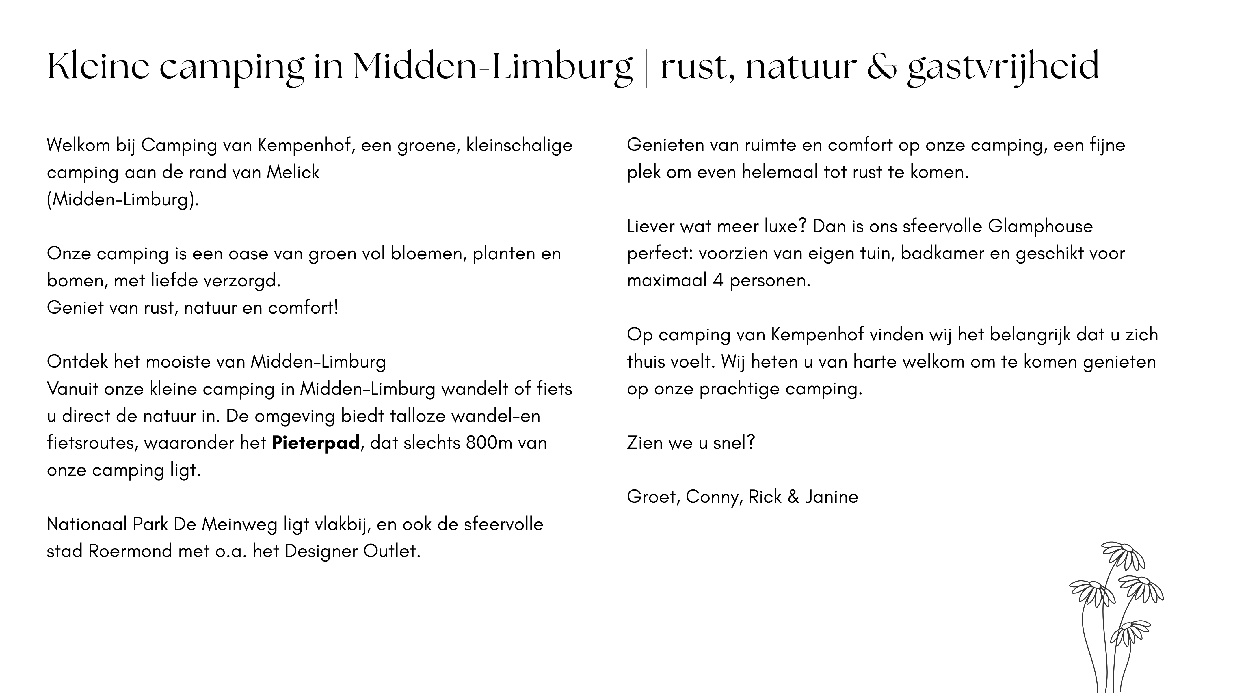 Wij zijn Conny en Janine (moeder en dochter) en wij zijn sinds mei 2019 trotse eigenaren van ‘Camping van Kempenhof’ in Melick, Midden-Limburg.