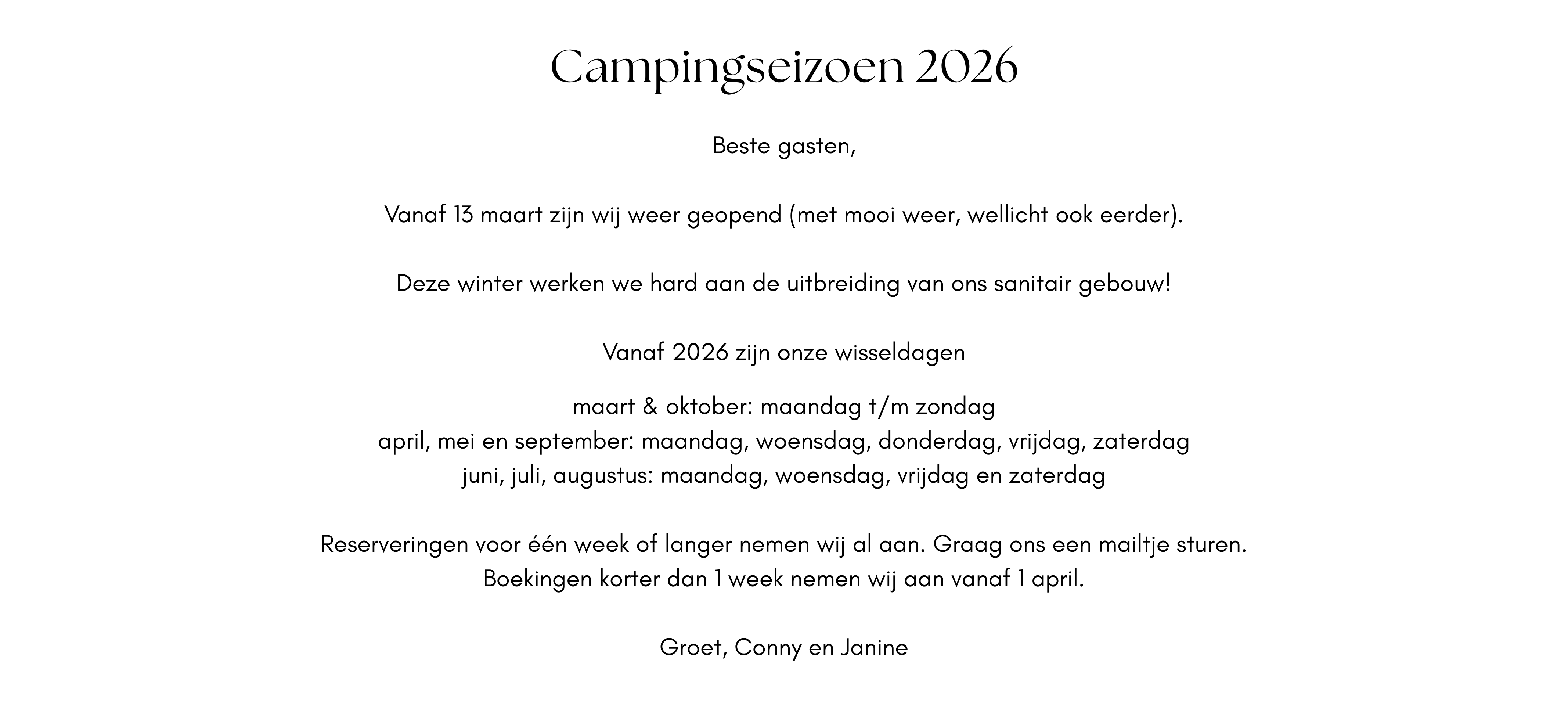 Met heel veel plezier runnen wij onze mooie camping. Samen met onze familie (Pieter, Rick en Hans) zorgen we er voor dat de camping er netjes uit ziet en onze gasten kunnen genieten van een heerlijke vakantie.